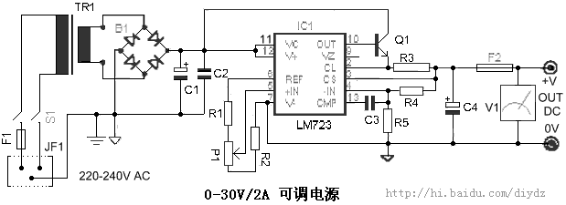 R1=1K2 C1=4700uF/63V IC1=LM723 V1=0-30V DC R2=680R C2=100nF63V MKT Q1=2N3055 TR1=220VAC/ 27V 4A R3=0.33R/5W C3=4.7nF63V MKT B1=100V 5A桥堆 S1=2×10A 开关 R4=15K C4=220uF/63V F1=0.5A 快速熔断保险 R5=3K9 P1=4K7 F2=2A 慢速熔断保险 |