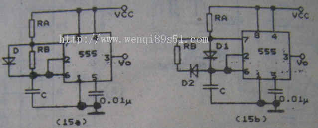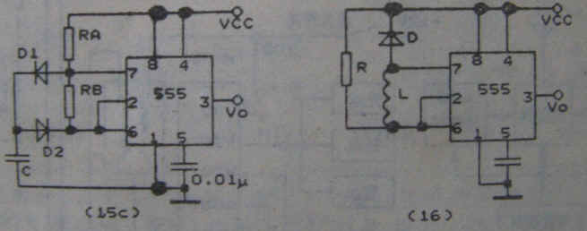1、图14是用通用的555时基电路构成典型的振荡器。当电源接通时,VCC通过电阻RA和RB向电容C充电。当电容刚充电时,由于2脚处于零电平,所以输出端3脚是高电平,当电源经RA、RB向C充电直到VC大于2/3VCC时,输出由高变低,电路内部放电管导通,电容C经RB和放电管(7脚)放电,到 VC小于1/3VCC时,输出又由低变高,C再次充电,如此周期重复,开成振荡,电路振荡周期T=0.7(RA+2RB)C,改变RA、RB可改变其振荡频率。 2、图15(a)-(c)是用555电路组成另一类振荡器。其原理与图14类同。图14中调节R、C的值,都可改变充放电时间,因此充放电的时间常数不能单独调整。在图15(a)-(c)中,设置了充放电引导二极管,充放电电阻RA、RB可以单独调节,在RA=RB的情况下,可以获得占空比为50%的方波。 3、图16是555电路与外接电阻R和电感L组成的多谐振荡器,其振荡频率与R、L的值有关。通电瞬间,电感线圈L中的电流不能突变,IL=0,故2、6 脚为“1”,3脚输出为“0”,电路内部放电管导通,L两端电压近似于电源电压,随着IL的增加,VL逐渐减小,即2、6脚的电位随之下降,降到 1/3VCC时,输出由低变高,此时555的内放电管截止,IL将减小。2、6脚电位随IL的减小不断上升,上升到2/3VCC时,输出由高变低,振荡频率f与R成正比,与L成反比,在实际应用中一般调节R来改变振荡频率。 |